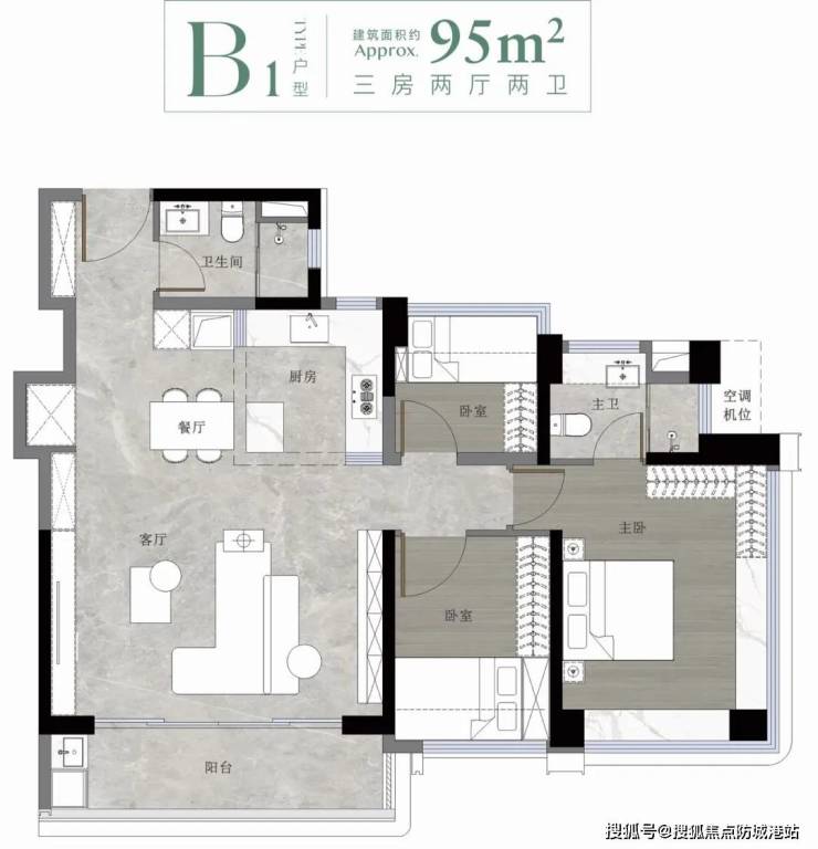 89㎡三房:南北通透,主卧带飘窗,得房率82%;
