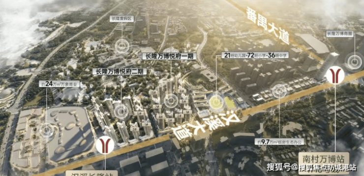 该项目交通优势显著,地铁出行极为便利。一期距离地铁3/7号线汉溪长隆站实际距离约500米,步行大约8分钟即可到达;二期更是下楼就到地铁口。3号线作为广州含金量极高的交通线,可直达体育西等核心区域;7号线是番禺首条东西向地铁,能通往广州南站、大学城、科学城等地;18号线为湾区高速地铁,可快速抵达琶洲、珠江新城等地。此外,项目距离地铁18号线南村万博站约1.2公里 。除了地铁,全国线路最密集、亚洲最繁忙的高铁站——广州南站,与长隆万博悦府直线距离仅约6公里 ,无论是在湾区内出行,还是前往全国各地,都能轻松实现,极大地提升了通勤效率与出行体验。周边还有多条公交线路覆盖,主干道贯穿全城,自驾出行时,小区出门就是汉溪大道,可便捷转至新光快速和华南快速,去往市区各地都较为方便。