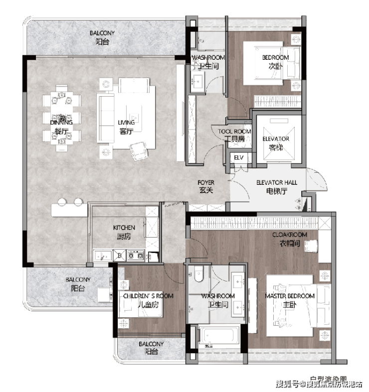 建面约200平方米的四房户型:拥有宽敞的电梯间和独立入户玄关,确保了私密性。南北双阳台设计,其中约7.5米超大阳台环绕客厅,为业主提供了舒适的休闲空间。