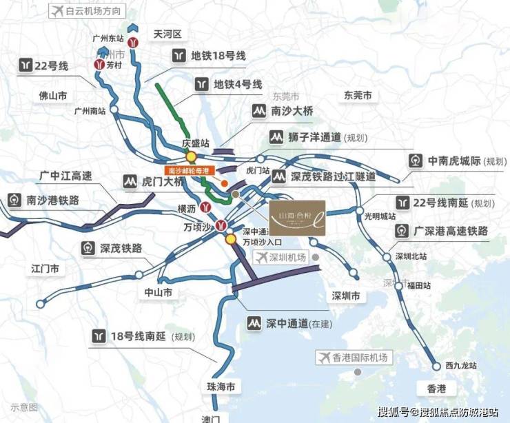 地鐵:距4號線、15號線(規劃中)、22號線(南連莞深,時速160km,首段已開通)三地鐵交匯的南沙客運港站僅900米,未來30分鐘直達廣州中心,2站可換乘深圳地鐵;