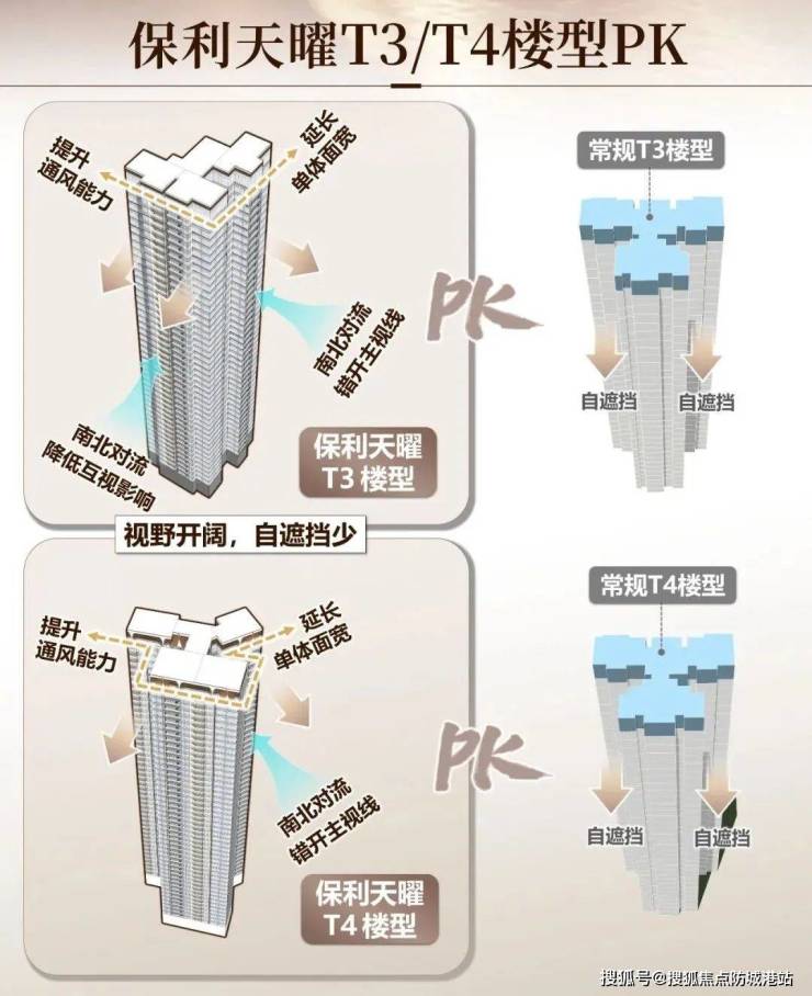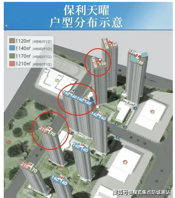 保利天曜分为南北两个地块开发,南地块采用板楼设计,共有8栋;北地块则是塔楼设计,共3栋。南地块主力户型面积段为120-210平方米四房,每栋楼之间的楼间距最宽可达70米以上,确保了良好的通风采光效果及侧向江景视野的最大化。