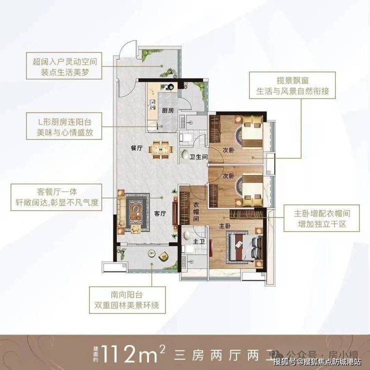 **112㎡三房两厅两卫**:南向望双重园景,四季风华尽收眼底,户型方正,无多余空间浪费,南向大开间设计,确保室内光线充足、空气流通,配备阔绰双阳台,分别用于休闲与晾晒,提升居住舒适度;主卧配备独立卫生间与衣帽间,保障业主隐私,次卧与书房空间充足,可灵活规划为儿童房或客房,满足三代同堂或多孩家庭的居住需求,空间利用率高达85%以上。