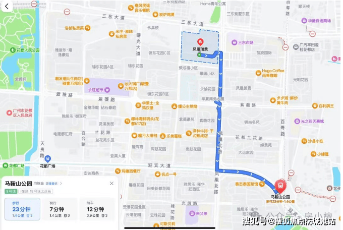项目交通配套完善,构建了“地铁+公交+主干道”的立体交通网络,全方位满足业主日常出行需求。项目步行至地铁9号线马鞍山公园站约1.4公里,步行时间约23分钟,该站点于2017年正式运营,可直达花都广场、广州北站等核心区域,未来还将接入地铁18号线北延段,进一步提升轨道交通便捷度。地铁9号线可无缝换乘广州地铁2号线、3号线,实现一小时直达广州主城区核心区域,满足业主跨区通勤需求。