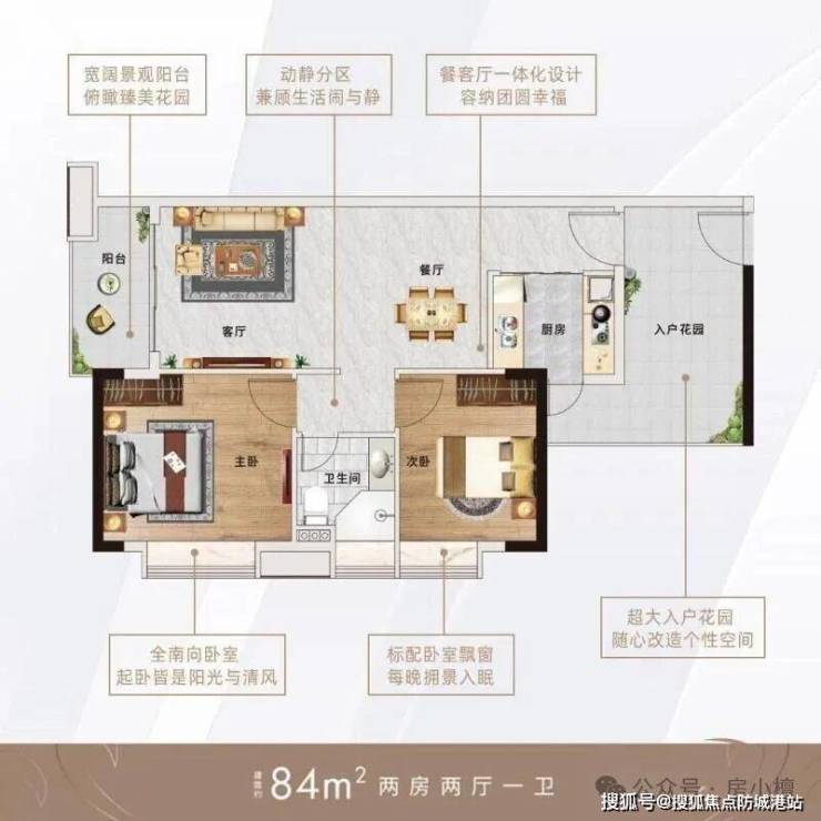 **84㎡两房两厅一卫**:超大入户花园设计,灵动空间可再增一房,性价比突出,适合年轻改善或刚需过渡家庭;户型方正,布局合理,南向设计,确保室内光线充足,客厅与阳台相连,拓展活动空间,主卧与次卧空间充足,配备观景窗户,可欣赏社区园林景观;厨房采用L型设计,操作空间充足,卫生间干湿分离,提升使用舒适度,整体空间利用率高达82%以上。