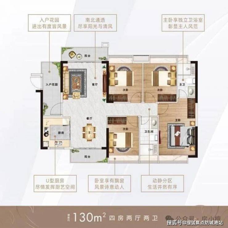 **130㎡四房两厅两卫**:臻稀正规大四房,南北对流设计,搭配超大入户花园,空间开阔,适合多孩家庭或三代同堂居住;四间卧室布局合理,空间充足,主卧朝南,配备独立卫生间与衣帽间,提升居住品质,次卧与书房可灵活规划,满足家庭不同需求;客厅与餐厅相连,打造开阔的活动空间,双阳台设计,分别用于休闲与晾晒,通风采光效果极佳,整体户型动静分离,兼顾私密性与实用性。