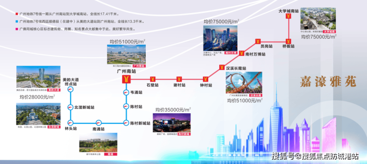 交通方面:地铁路网——广州地铁7号线(已通车)起点站由大学城南至美的大道全方位无缝连接广佛