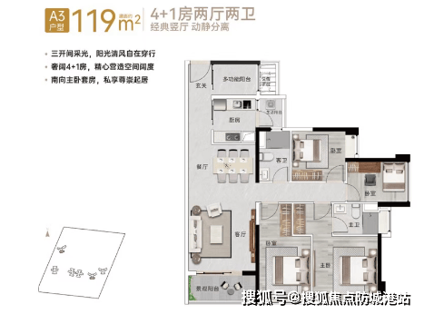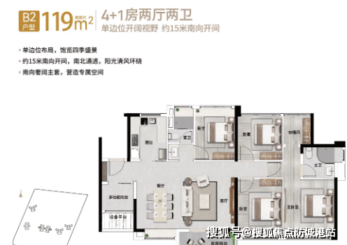 119㎡四房+1厅2卫:单边位布局,南向开间宽大,南北通透。