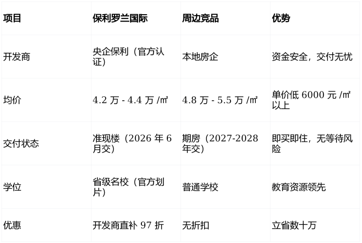 性价比断层领先:同板块竞品均价 4.8 万 - 5.5 万 /㎡,保利罗兰国际官方均价 4.2 万 - 4.4 万 /㎡,108㎡户型低至 3.9 万 /㎡,价格优势明显,去化率稳居板块第一。