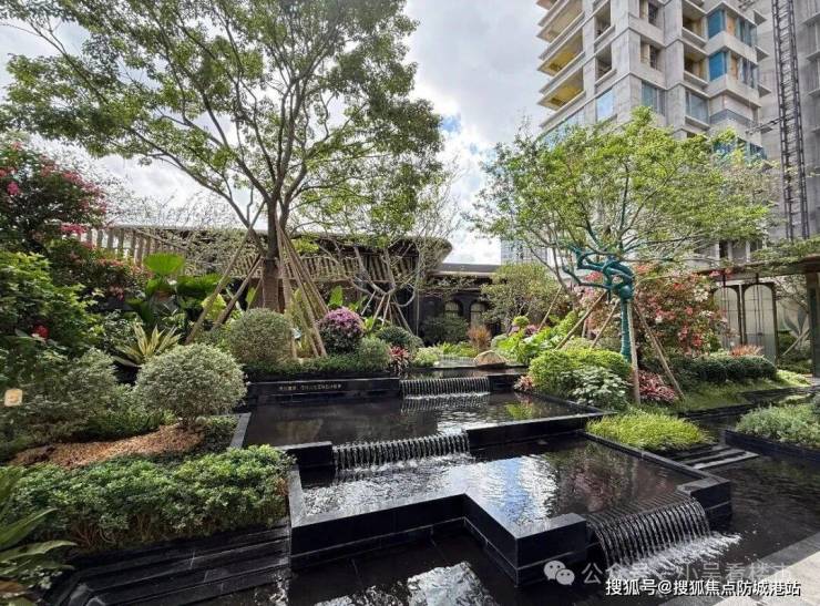 流花水院借鉴东京虹夕诺雅酒店的园林风格,打造叠水式瀑布景观,营造五星级酒店归家体验。造型朴树,精品紫花风铃木、黄皮、鸡蛋花、玉芙蓉、造型勒杜鹃、米兰、鼠尾草、玉簪、月季等,丛叶香到花香再到果香,沉浸馥郁芬芳。
