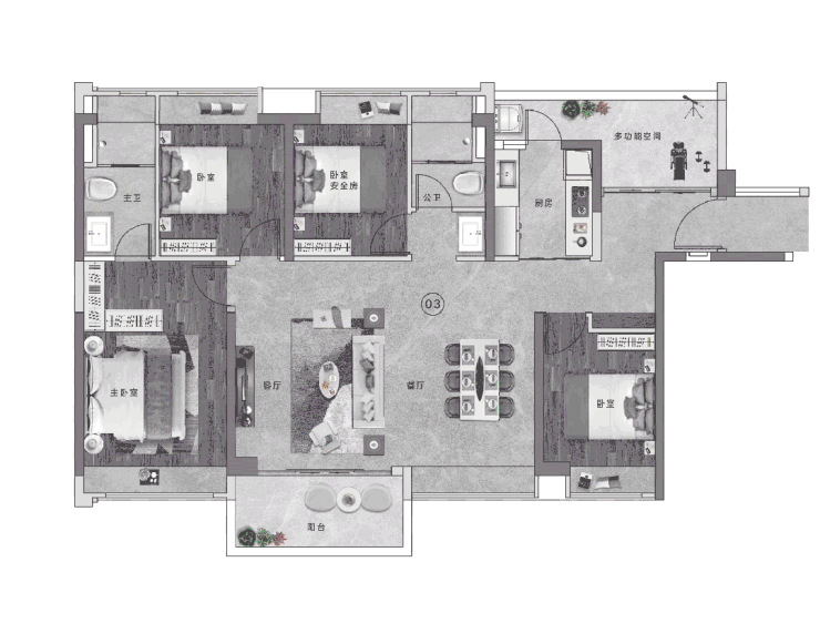 137㎡户型空间感极致,4+1 房设计适合大家庭。