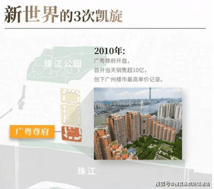作为珠江新城开发模式的先行者,新世界中国在当年的珠江新城并没有任何成熟的模版可供参考。他们凭借领先世界的规划理念和坚定的发展魄力,硬生生地在广州开辟出了一条高端住宅的新路。2003年,在非典疫情肆虐、楼市低迷的背景下,凯旋新世界一期枫丹丽舍逆势开盘,以约8000元/平方米的均价,一举确立了广州顶级高端社区的标杆地位。2010年,在全球金融危机的余波未平之时,凯旋新世界广粤尊府首开即狂销超10亿元,创下广州楼市最高单价纪录,成为当时市场信心的最强音。