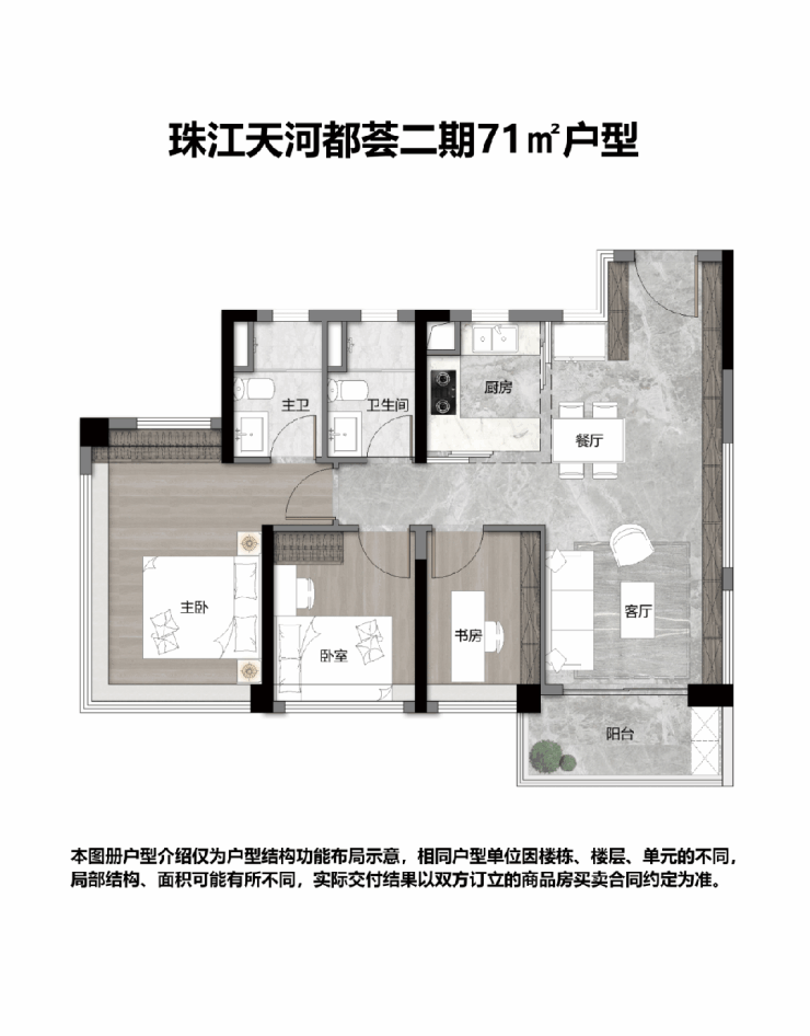 在土地资源日益稀缺的背景下,如何在有限的面积内最大化空间效用,是考验开发商设计功力的关键。珠江·天河都荟的72平方米户型,堪称这一命题的优等生。该户型做到了三房两卫的格局,且所有卧室均朝南,这在同面积段产品中极具竞争力。传统市场上,72平方米通常只能做成紧凑的两房单卫,或者勉强挤出三房但牺牲采光与舒适度。而该项目通过优化墙体厚度、利用飘窗与阳台等赠送空间,将实际使用率提升至超120%。入户花园的设置增加了玄关的收纳功能,南北双阳台的设计不仅拓展了晾晒与观景的空间,更实现了良好的空气对流。对于首次置业的年轻家庭或预算有限的刚需群体,这一户型以较低的总价门槛,提供了满足三代同堂短期居住或二胎家庭长期使用的可能性,极大地提升了空间的性价比与实用性。