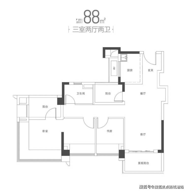 88㎡三房两卫:虽面积紧凑,但主卧尺度突出,L型收纳系统提升实用性;部分飘窗可改造为功能区(报建80cm,可打掉50cm),进一步释放空间;