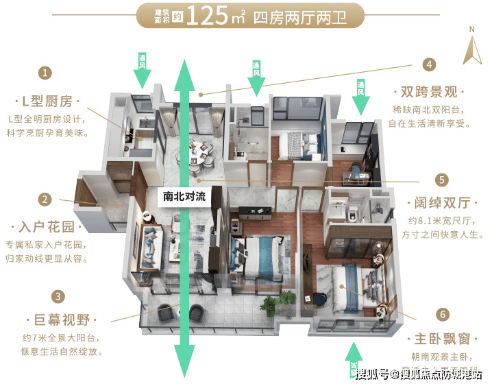 建面约125平方米南北对流四房:整体布局为四房两厅,双阳台设计,南北对流。7米长的南向全景大阳台让空间更加宽敞明亮,主卧配备全景飘窗,不仅增加了视野开阔感,还可以俯瞰远方的生态景观。