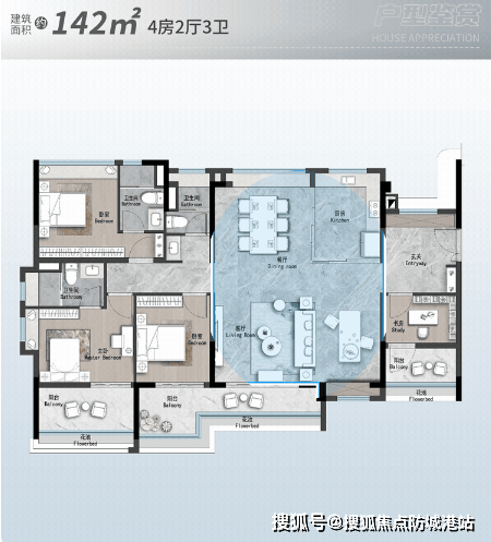 (4)建面143㎡四房两厅两卫:高端改善户型,南北双阳台,客厅面宽4.8米,主卧面宽3.8米,次卧面宽3.2米,公摊面积21.5%,得房率78.5%,户型方正大气,采光通风极佳,总价约893.75万元,首付最低15%约134.06万元。