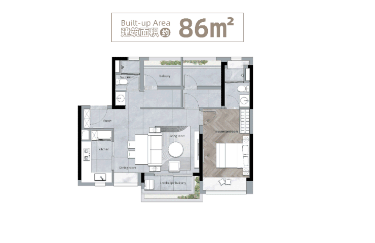 第一种主力户型:建面约86㎡三房两厅两卫,该户型为刚需首选,分布于1A、1B栋的一条梯腿,总价约390万起,主力价格410-440万,得房率100%,装修标准为高品质刚需装修,贴合刚需、入门级刚改人群的品质需求与预算。户型整体布局方正,采用舒适度较高的横厅设计,南北通透,采光通风效果极佳,主阳台、主套间均朝南,舒适度较高,能够充分享受阳光照射,提升居住体验。客厅连接南向阳台,阳台视野开阔,可欣赏社区园林景观,闲暇之余可在阳台喝茶、休闲、晾晒,满足日常使用需求;主套间设计,配备独立卫生间,提升了居住的私密性和舒适度,适合主人居住;两个次卧空间宽敞,可作为儿童房、书房或客房,满足不同家庭的需求,其中一个次卧可改造为多功能室,满足家庭的多样化需求。