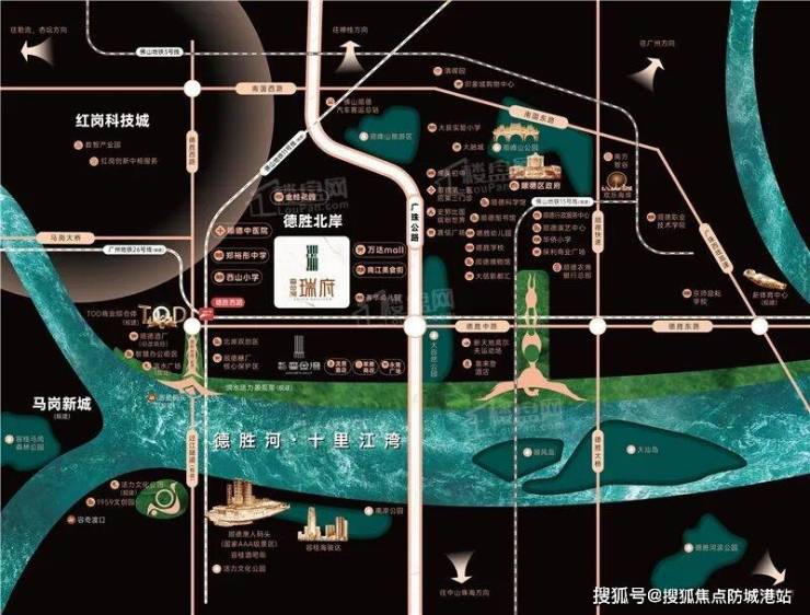 涛汇鎏金湾二期瑞府的战略地位,源于其占据顺德城市升级的黄金交汇点。项目地处德胜新城与红岗科技城双城交汇带,串联三大城市级平台——105黄金走廊(红岗科技城)、顺德工业历史文化带(顺德糖厂活化工程)及马岗智造新城,形成集科技、人文、生态于一体的“湾式经济圈”。