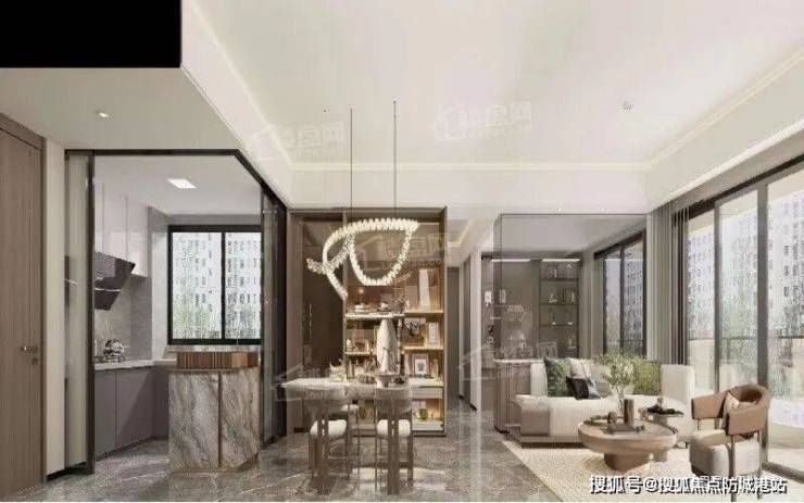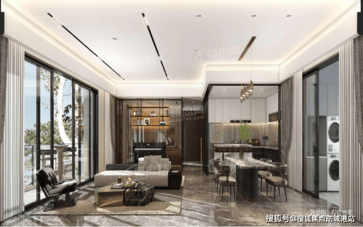 (2)轻奢美学:以“大都会风格”为基调,通过全景落地窗、开放式厨房、约12米南向巨幕阳台,引江景绿意入室,重塑雅致生活场域;