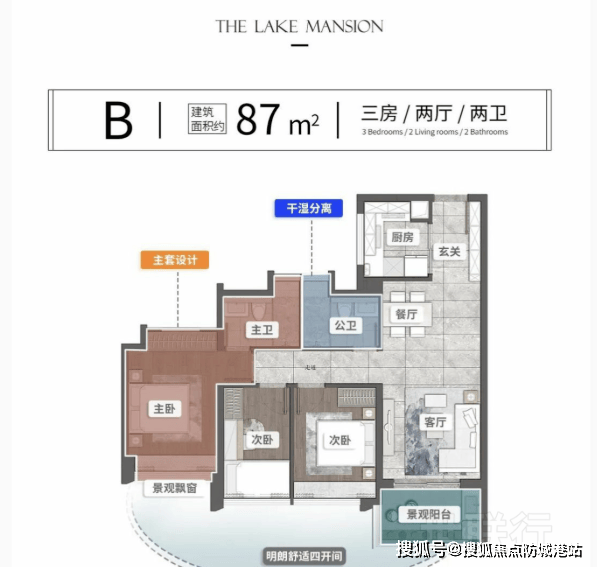 87㎡自住首选三房:四开间朝南,望湖动静分区,通透采光高赠送,使用率近100%