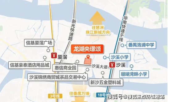 龙湖央璟颂在交通配套上极具优势,3+18 双地铁环绕,为居民通勤提供极大便利。项目距离 18 号线沙溪地铁站约 600-700 米,搭乘该线路 1 站可达万博、2 站至琶洲、3 站直达珠江新城,20 分钟即可抵达珠江新城核心区域;距离 3 号线厦滘站约 1 公里,通过电鸡接驳轻松换乘。自驾方面,依托新光快速、华南快速、番禺大道、广州大道南等交通干道,15 分钟可到达珠江新城、琶洲、海珠中心,10 分钟直达万博核心,再加上环城高速、南大干线两条横向路网,形成立体交通格局,便捷连接城市各个角落。