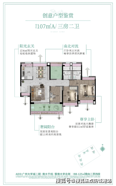 107㎡A 四空间:4.5 开间朝南,客厅与主卧双南北对流,5.9 米长观景阳台拓展视野,交互式方厅可开可合,提升空间灵活性;