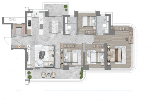 动区主打灵动空间布局,将不同功能区域融合或分离,灵动实现三四房切换。LDKB+X一体化设计,不仅放大了空间感,且聚合性更强,约8米双面宽阳台,连通客厅和卧室,让两个空间share窗外风光。