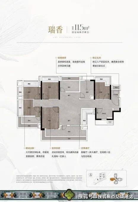 115 平户型:同样有多个飘窗,拓展了室内空间。主卧套间设计,配备衣帽间和主卫,保障了居住的舒适性和私密性。客厅与阳台相连,视野开阔。