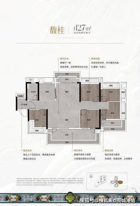 127 平户型:空间较为宽敞,设有储藏室,增加了收纳空间。主卧套间带有 270° 观景飘窗,可尽览窗外美景。客厅与餐厅相连,活动空间开阔。