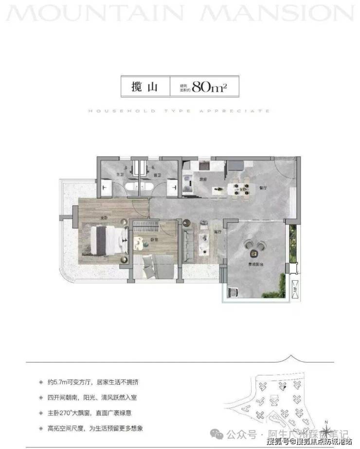 建面约 86㎡西南向三房两卫户型,是 80㎡全能户型的进阶之作,在保留全能功能布局的基础上,进一步升级了空间尺度与观景视野,为刚需家庭提供更舒适的居住体验。