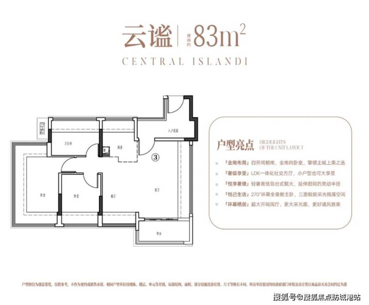 84㎡三房两厅:四开间朝南,主卧270°转角飘窗,得房率82%;