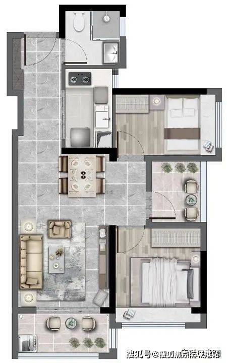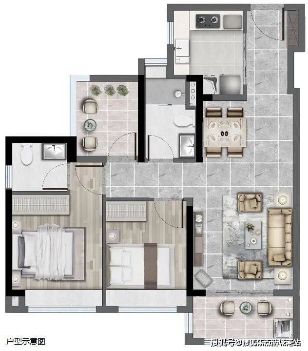 66㎡ 2房2厅1卫:南向设计,功能齐全,多一灵动空间。
