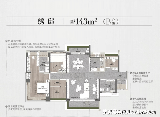 143㎡四房:总价335万-443万,主卧套房+双阳台,兼顾功能与仪式感;