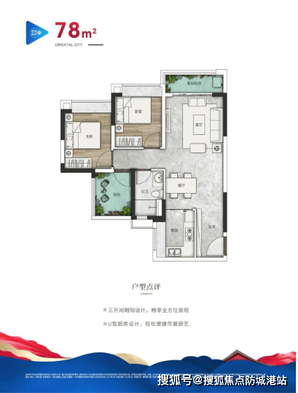 78㎡:三开间朝阳,U型厨房设计。
