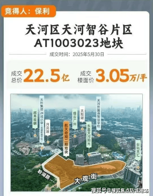 航天奇观二期由保利发展开发,位于广州市天河区的世界大观板块。该项目于2025年5月30日以约22.5亿元的总价被保利拿下,楼面价达到每平方米3.05万元。作为保利在广州的首次拿地行动,航天奇观二期迅速成为市场关注的焦点。