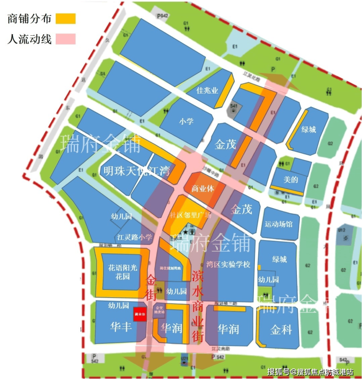 岭南钻石水乡社区的商铺分布集中在瑞府两侧,东侧是滨水商业步行街,西侧是灵山岛金街。