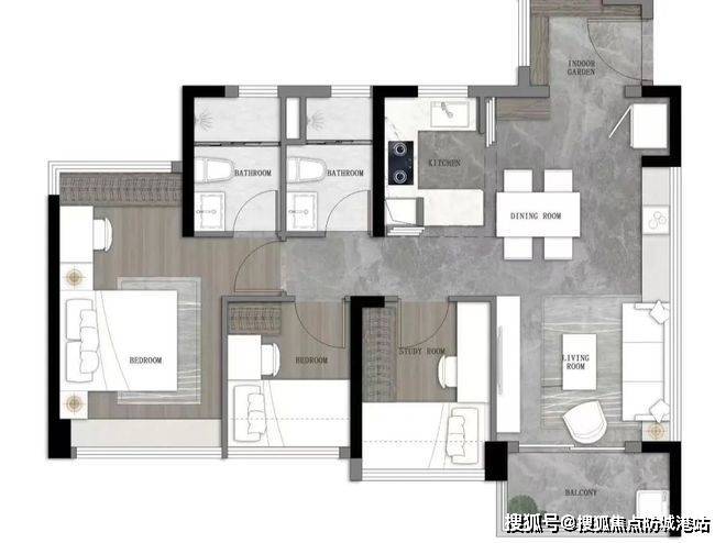 建面约103㎡户型,在入户处新增了一个房间做到四房,布局也变成了横厅布局,南北对流更加通透。