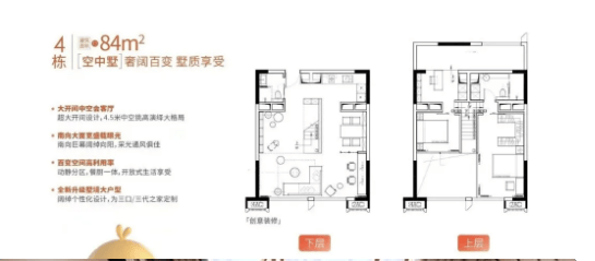 84平方米东南/西南/东北向户型:该户型为项目旗舰户型,空间宽敞大气,4.5米层高复式中空设计,通透感与仪式感拉满。一层规划客厅、餐厅、厨房、卫生间与一间卧室,方便老人或客人居住;二层设置三间卧室与两间卫生间,满足多人口家庭居住需求。朝向优越,采光通风极佳,部分户型可直瞰一线江景,视野开阔,带装修交付,配备高端家电与建材,同时支持双钥匙设计,投资自住两相宜。