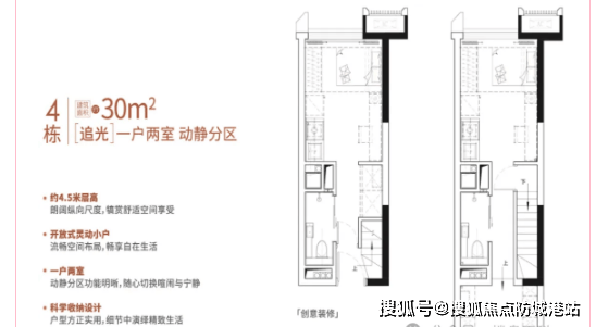 30平方米西北向户型:该户型为小户型复式产品,4.5米层高可轻松打造双层空间,一层作为客厅、厨房、卫生间等公共区域,二层作为卧室,实现动静分离。虽然面积不大,但空间利用率极高,无浪费面积,带装修交付省去装修烦恼,总价低至55万,是刚需置业者与投资者的优质选择。西北向户型可俯瞰社区园林景观,视野开阔,通风效果良好。