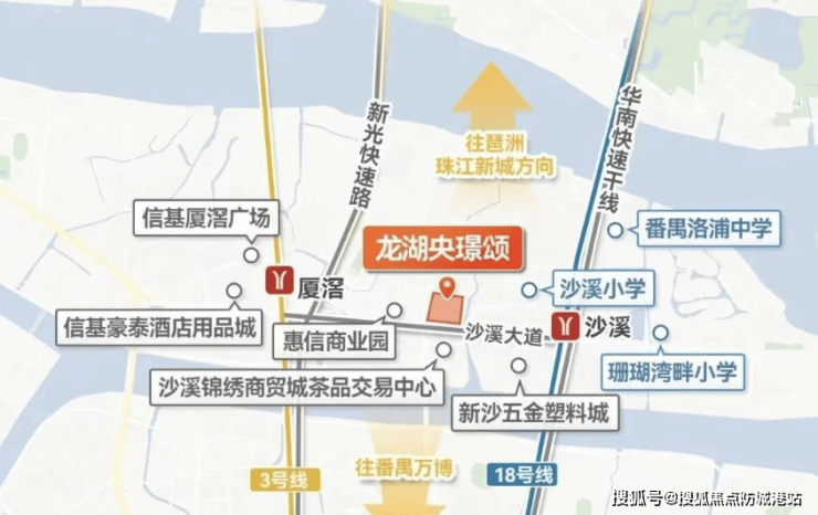 龙湖亚伦·央璟颂交通优势显著拥有3号线和18号线双地铁环绕距离18号线沙溪地铁站约600 - 700米1站可到万博2站到琶洲3站直达珠江新城去往3号线厦滘站约1公里电鸡接驳较为方便。
