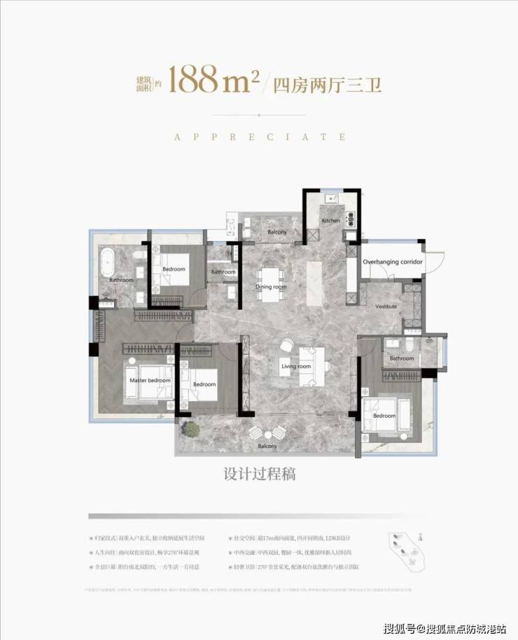 产品优势:126%得房率,实际使用面积超周边项目20%,103-186㎡四房设计满足不同家庭需求