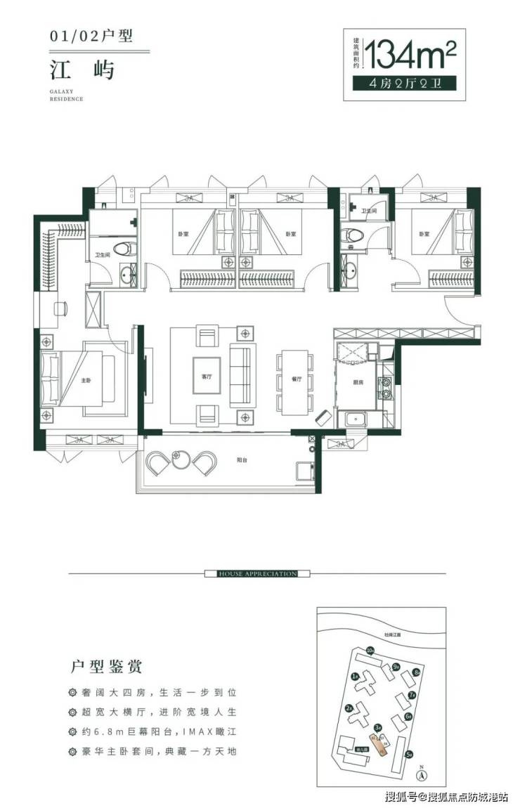 奢阔大四房,生活一步到位;超开阔横厅设计,进阶宽境人生;约6.8米巨幕阳台,IMAX瞰江;豪华主卧套间,典藏一方天地。
