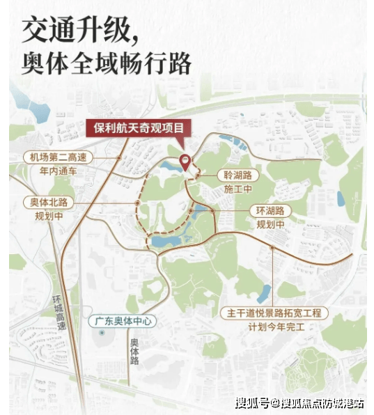 2. 广州十五届全运会带动奥体板块全面升级,基建红利持续释放。十五届全运会落子奥体,推动奥体板块迎来大规模城建开发红利,总投资680亿元实施80个道路项目建设,打通“六横七纵”交通主动脉,悦景路拓宽工程即将完工,聆湖路等规划道路逐步推进,板块交通、配套全面升级,周边楼盘价值迎来新的增长契机,保利辰园湖境作为奥体板块核心楼盘,直接受益于此次升级红利。