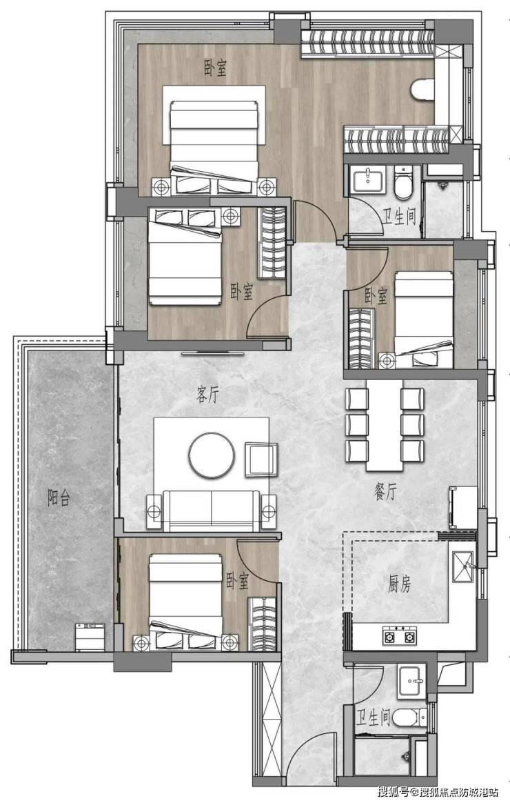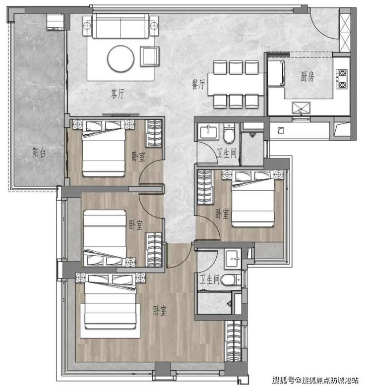 建面约85㎡三房两卫:市中心少有的全能进阶三房,功能齐全,适合小家庭。
