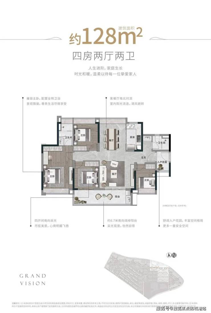 奢阔进阶大四房 128㎡四房两厅两卫,约6.7米南向阔绰阳台,采光观景怡然自得,四开间南向采光,南北对流,阳光流连,舒适入户花园,多一重收纳、安全空间,雍容主卧全明位于,尊享生活享受。
