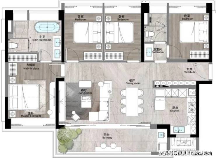 125㎡四房:南北对流格局,客厅开间4.2米,连接3.8米南向阳台,主卧配备独立卫浴和飘窗,得房率82%(含赠送面积)。