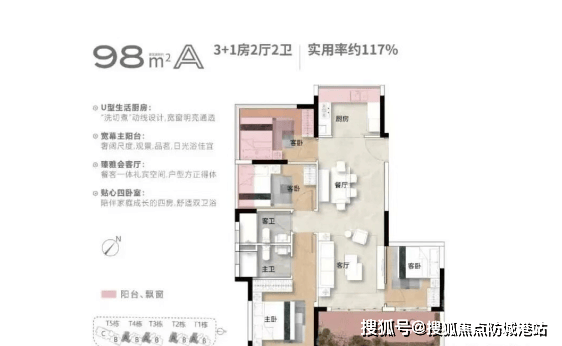 项目主推三个户型:98平、108平和156平,全部做成四房。这在同面积段的产品里,绝对是“卷王”级别的存在。