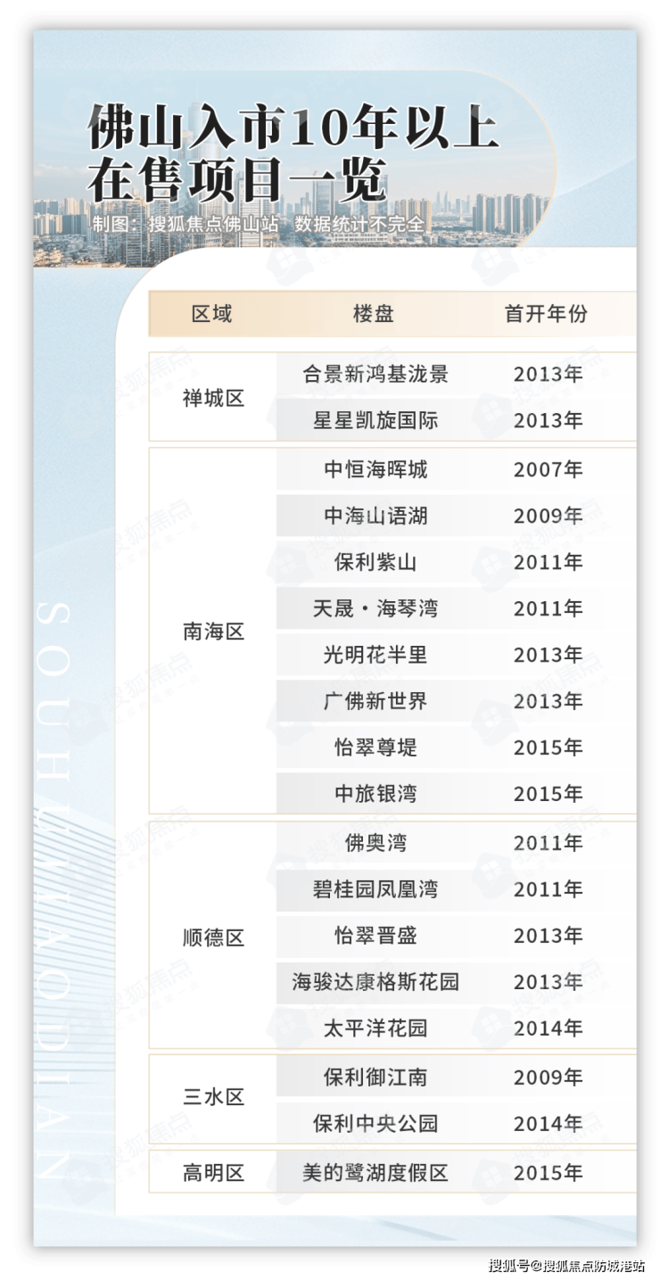 据不完全统计,目前佛山入市 10 年以上且仍在售的项目共有 18 个,广泛分布于禅城、南海、顺德、三水和高明等区域。其中,禅城有 2 个老盘,均已入市 12 年;南海数量最多,占 8 个;顺德有 5 个;三水占 2 个;高明则仅有 1 个。