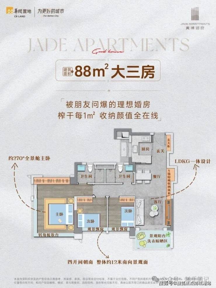 项目主推建面约88-113㎡的精装三房/四房,这些户型在保持紧凑布局的同时,通过LDKG一体化设计(客厅、餐厅、厨房、阳台一体化)、南向面宽最大化、创新收纳交标等手段,将实用率提升到了惊人的水平。据测算,部分户型的实际使用率甚至超过了100%,这意味着您用购买90㎡的钱,却能享受到100㎡以上的实际居住空间。