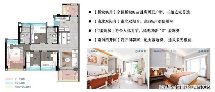 87㎡四房:南北双阳台,四开间朝南,实用率105%