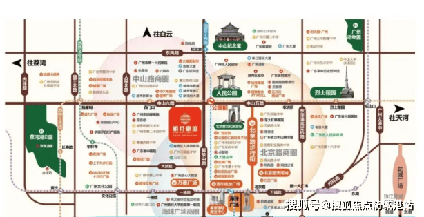 明月豪庭坐落于广州市越秀区解放中路459号,地处北京路商圈、中山六商圈与海珠广场批发商圈三重繁华交汇点。这里是广州千年商贸文化的发源地,亦是城市发展的原点。项目紧邻地铁1号线与2号线换乘枢纽——公园前站A出口,直线距离仅约200米,一首歌的时间即可抵达站口,真正实现“地铁上盖”级通勤效率。